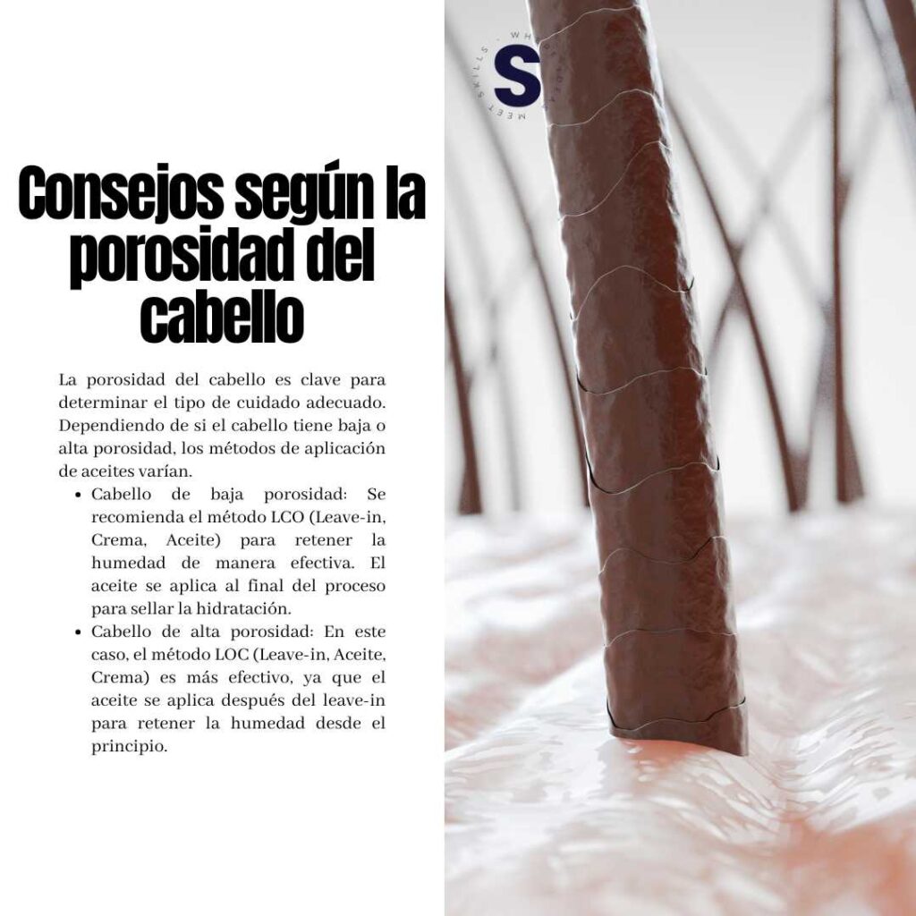 La porosidad del cabello es clave para determinar el tipo de cuidado adecuado. Dependiendo de si el cabello tiene baja o alta porosidad, los métodos de aplicación de aceites varían.