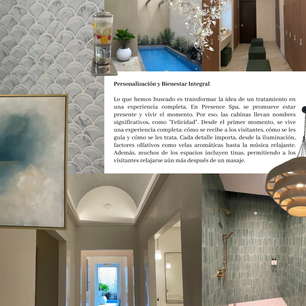 Lo que hemos buscado es transformar la idea de un tratamiento en una experiencia completa. En Presence Spa, se promueve estar presente y vivir el momento. Por eso, las cabinas llevan nombres significativos, como “Felicidad”. Desde el primer momento, se vive una experiencia completa: cómo se recibe a los visitantes, cómo se les guía y cómo se les trata. Cada detalle importa, desde la iluminación, factores olfativos como velas aromáticas hasta la música relajante. Además, muchos de los espacios incluyen tinas, permitiendo a los visitantes relajarse aún más después de un masaje.