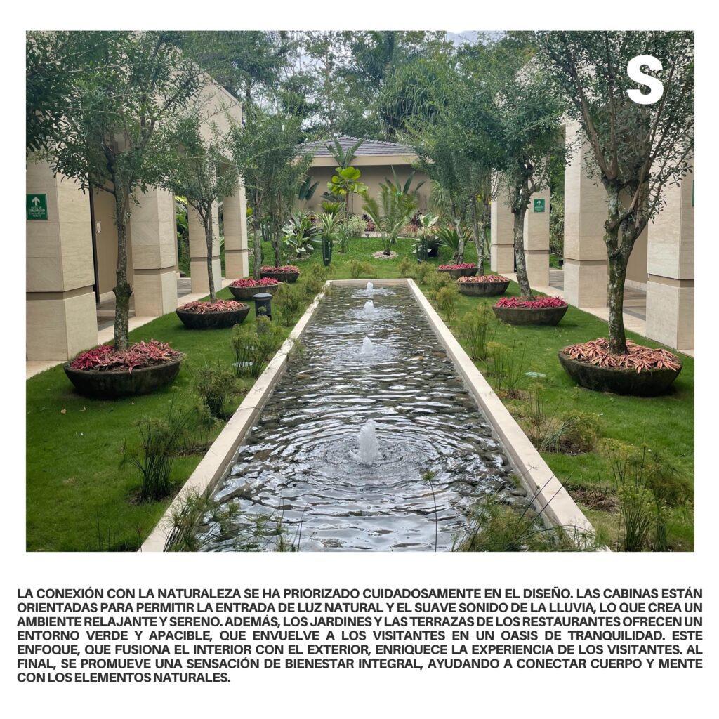 La conexión con la naturaleza se ha priorizado cuidadosamente en el diseño. Las cabinas están orientadas para permitir la entrada de luz natural y el suave sonido de la lluvia, lo que crea un ambiente relajante y sereno. Además, los jardines y las terrazas de los restaurantes ofrecen un entorno verde y apacible, que envuelve a los visitantes en un oasis de tranquilidad. Este enfoque, que fusiona el interior con el exterior, enriquece la experiencia de los visitantes. Al final, se promueve una sensación de bienestar integral, ayudando a conectar cuerpo y mente con los elementos naturales.