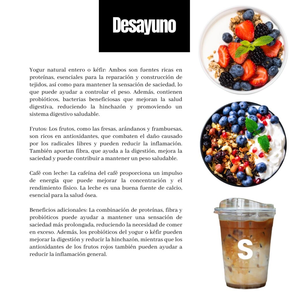 Para empezar bien el día, un desayuno nutritivo es clave. Se recomienda un yogur natural entero o kéfir con frutos rojos y un café con leche. Este tipo de desayuno proporciona proteínas y antioxidantes esenciales.