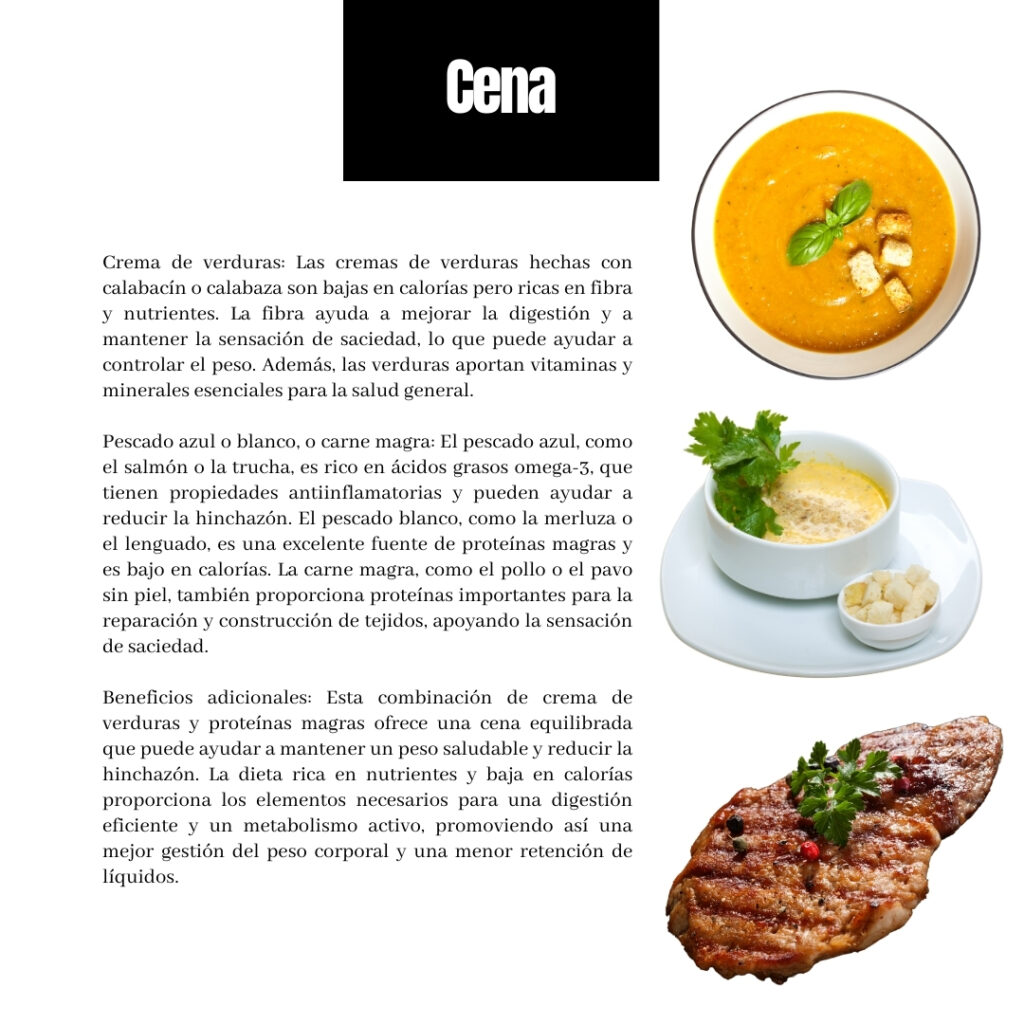 Para la cena, se sugiere una crema de verduras como calabacín o calabaza, acompañada de pescado azul, blanco o carne magra. Este tipo de cena es ligera y rica en nutrientes.