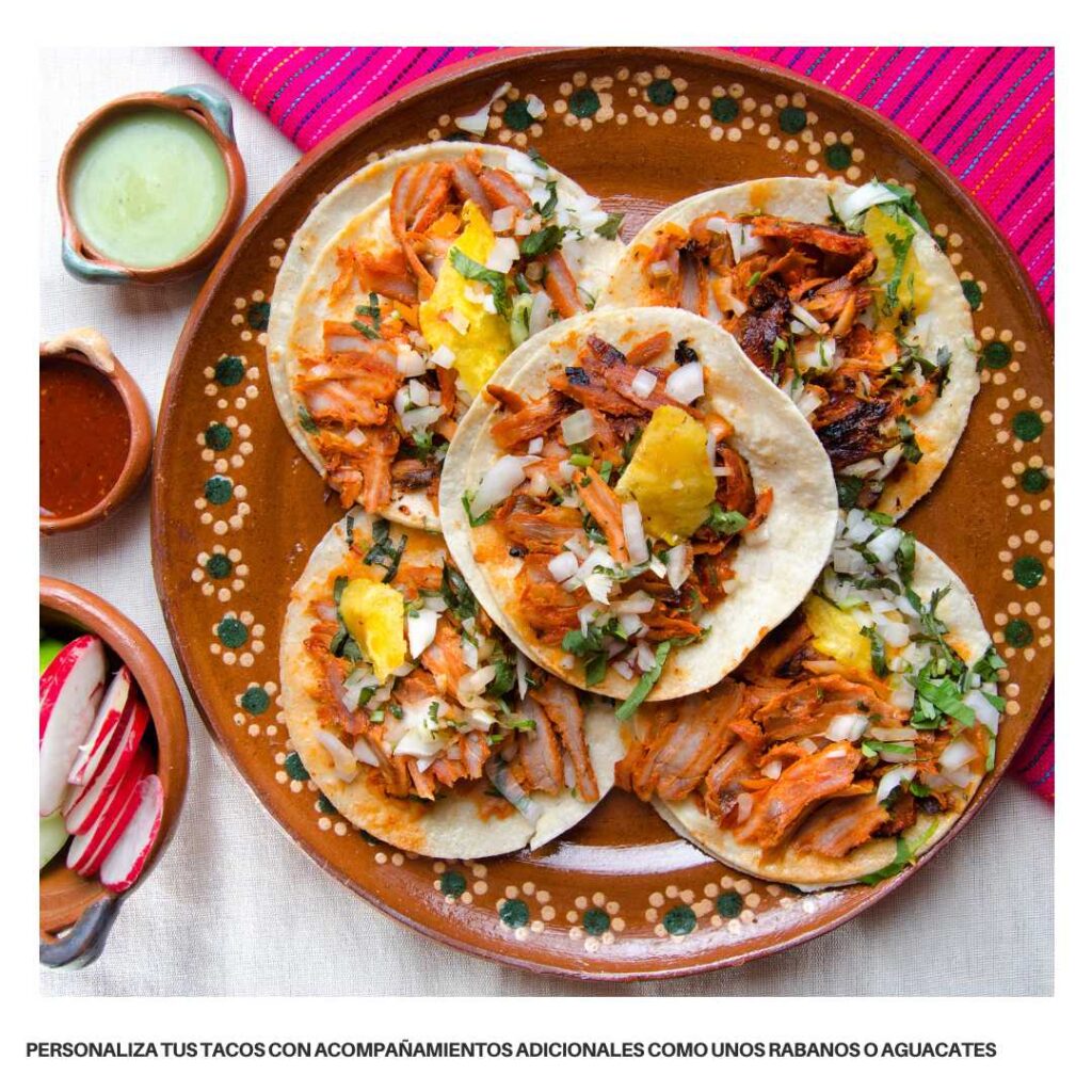 • Acompañamientos: Personaliza tus tacos con acompañamientos adicionales como rodajas de jalapeño o aguacate según tu preferencia.